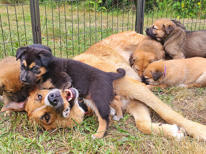 Week 6 has ended and these puppies are growing fast! Several are now over 11 pounds now and their activity level has increased substantially. They continue to expand their exploration of our yard and quite often go in opposite directions at once so it’s always fun to chase them down!