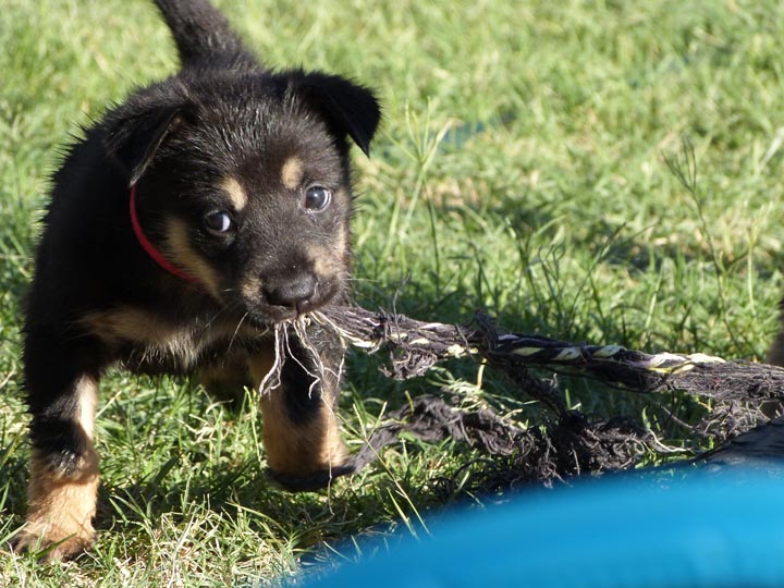 Week 5 – These weeks seem to be flying by. Our adorable little puppies grow a little every day and with each day they are doing something new! This is when they start seeing toys as an exciting thing to chew on, carry around and play tug with. It's not just nibbling on our toes and chewing on each other anymore. It's adorable to see a little puppy proudly prance around with a toy in their mouth like they just won a prize (Nacho is one of the main toy lovers and does this frequently)! Toys makes interacting with them more fun (and less painful for us- those darn puppy teeth), and opens their world up to so many other fun games like keep away and tug of war. The tunnel, with big sister Zazu inside, is a favorite game as they launch themselves at the tunnel to attack Zazu! Watch out Zazu, they're starting to organize their attacks on you...