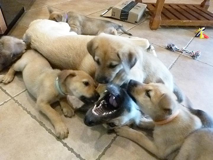 Week 7 – Mad Max. This title comes to mind as I watch these huge puppies racing through my kitchen chasing after each other with their teeth out! The high temps and evening storms are forcing us to spend more meal and play times indoors. The pups are no dummies, they do their business in the yard and then race to the sliding door wanting to come into the A/C. Once inside they perk up and run around like mad dogs! Play fights are more serious and these little guys have speed as they zoom around the kitchen. Play time can last over an hour now so with ten puppies playing like crazy, it wears you out!