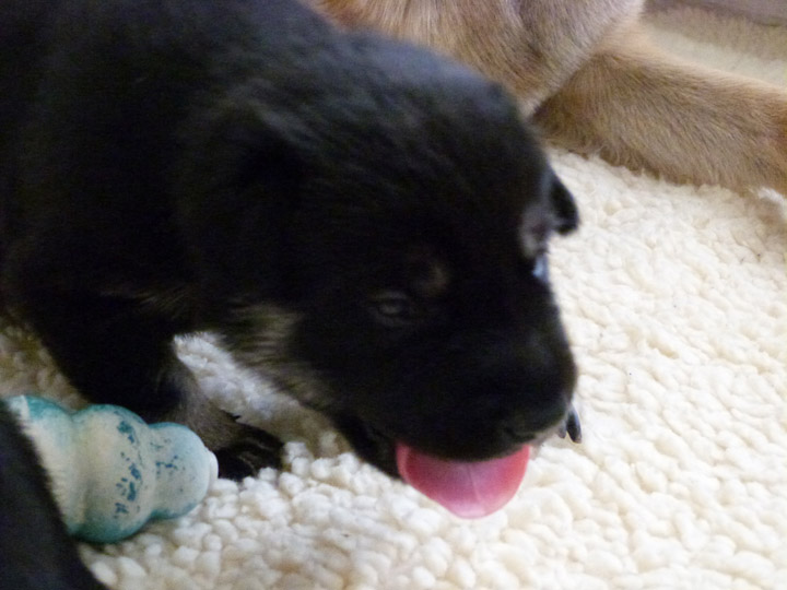 The puppies personalities are starting to show now too. Since they're young and everything is new to them, they have a lot of cute awww moments that make me fall in love with them over and over. Every couple of days I have a new 'favorite' pup as they do all these adorable things. Right now whenever Winter wakes up, he growls! He growls not only when I poke him to wake him up, but also when he wakes up on his own. It's pretty hysterical to hear a 3 pound puppy that can barely walk growl at you! :D And it's even more fun when I growl back at him and he looks at me like "what in the world is that!?"