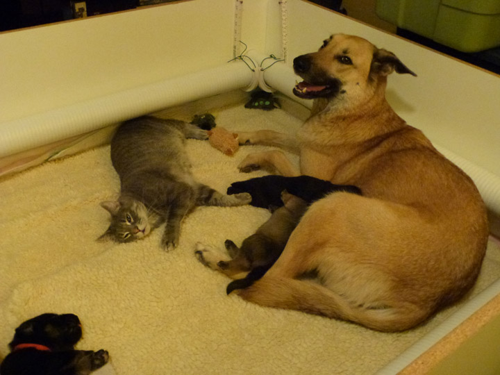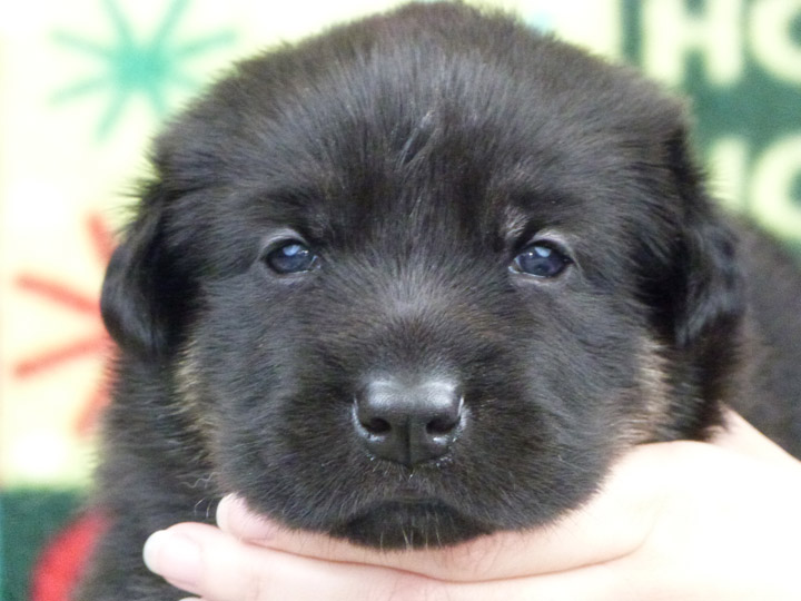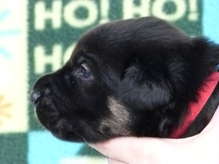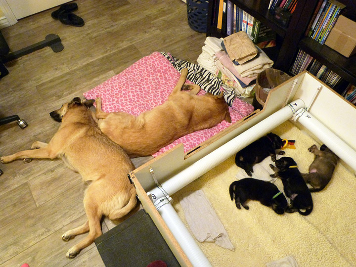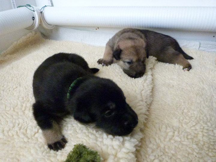 Week 2 is the start of the puppy fun! It's the stage of when they look and act like dogs. All eyes and ears are open so it's a whole new world for the puppies, and a lot more fun for us! We moved them to the dining room so they are in the middle of the active household to get them used to new sights, noises, surfaces, etc. They are getting more and more mobile as they walk around on their wobbly little legs. If we see them awake, we usually stop whatever we're doing to go play with them since they're play sessions are usually around 10 minutes long. Sometimes though we can sit down and just stare at them and they'll seem to wake up and show interest in playing with us. That is my favorite thing to do- sit in front of their whelping box (or pen when they're older) and come say hello and they all get excited to see me and come over with tails wagging and making cute puppy sounds! :)
