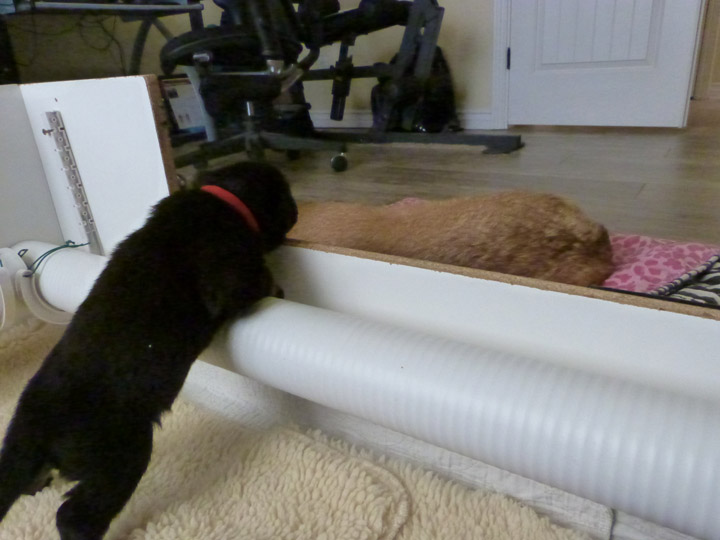 Even with Winter's cute growls, it seems Silver makes the most sounds. He does the loud "Mew" bark and growls and squeals. We actually heard him making little sounds that would be the puppy equivalent of snoring. Wish we had the camera close by for that one. Frosty is our most interactive pup at this time, always coming over to check out what is going on and to be in the middle of the action.