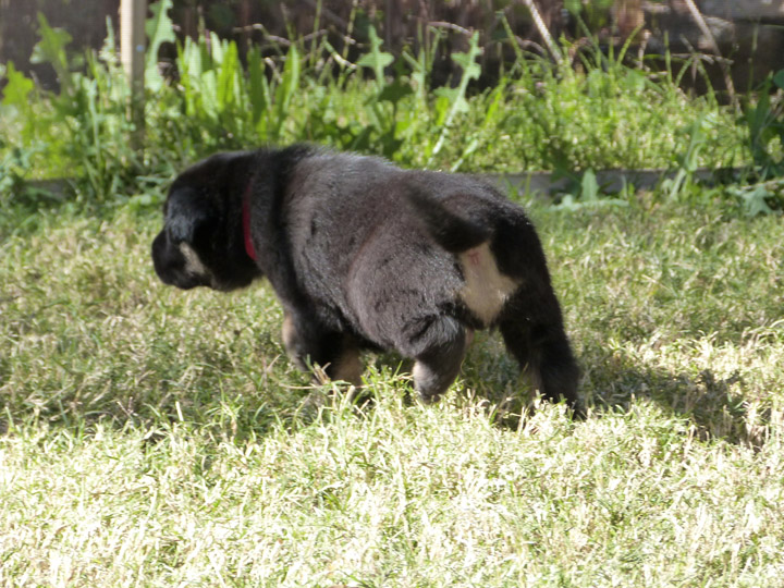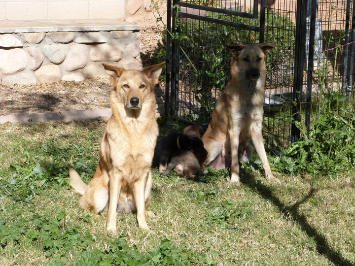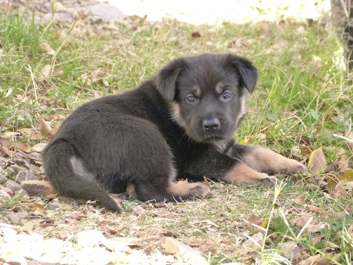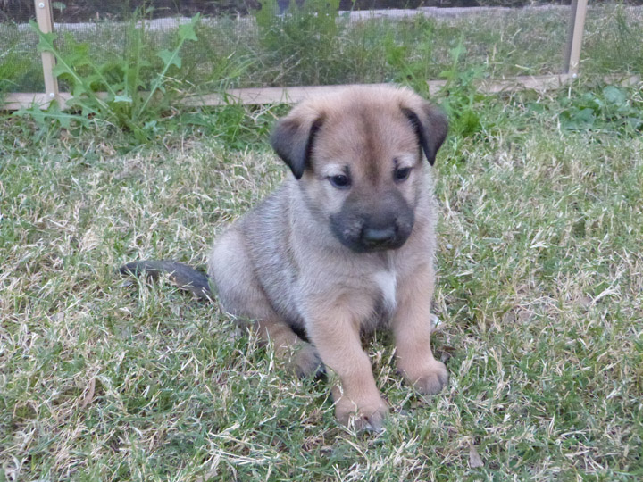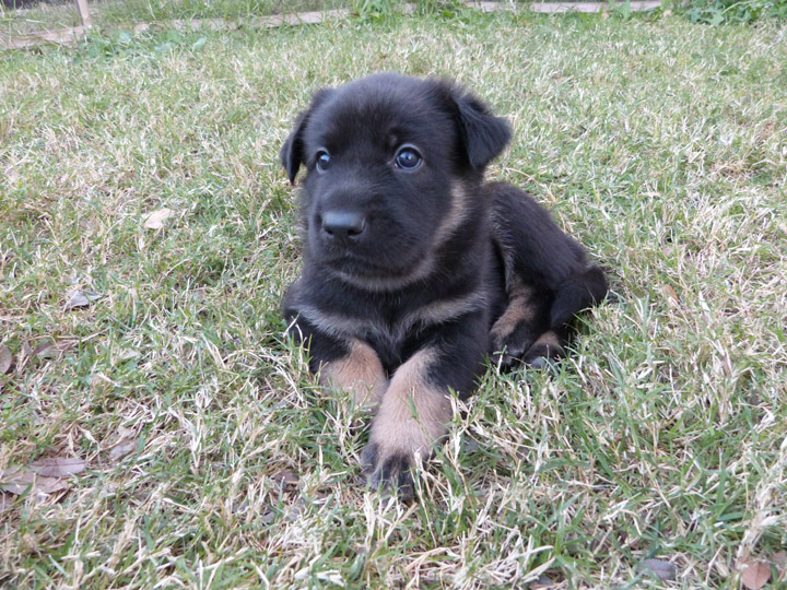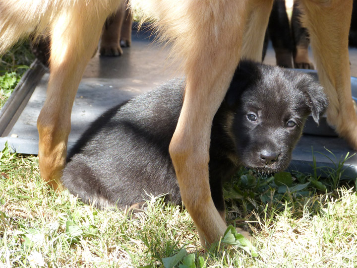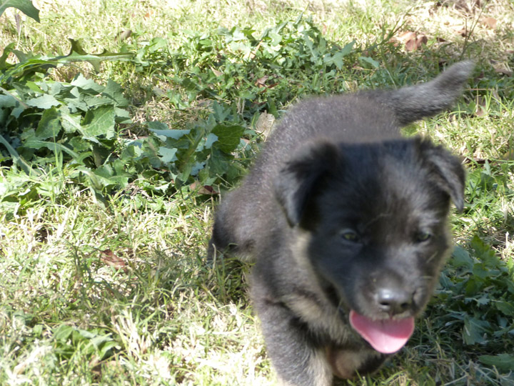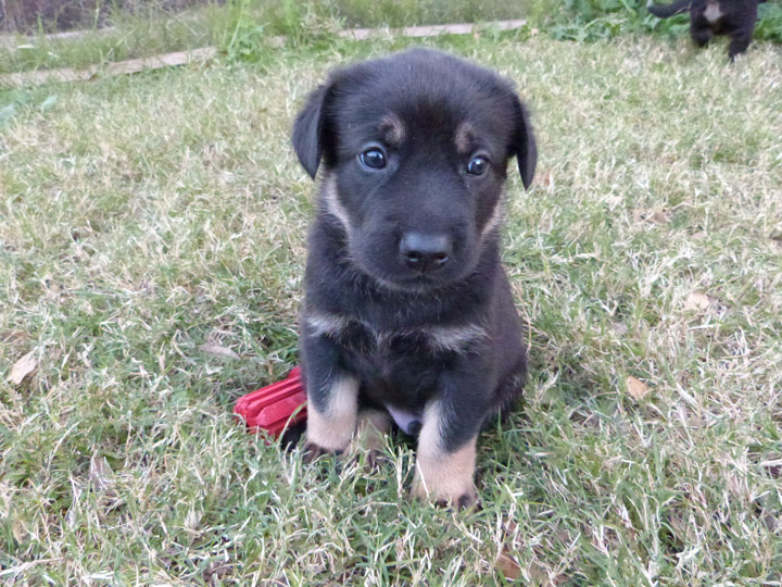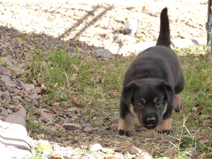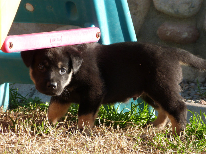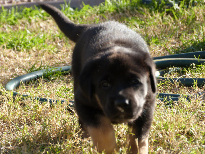 Week 4 is a fun week with the puppies. They are more mobile, playful, kissable little explorers, but not too active that they drive us nuts! Our unseasonably warm winter has brought us outside earlier and longer than our first litter that was also in the winter time. It's nice to be outside in the fresh air, where they can run around and explore and play without chewing on things they shouldn't like our cabinets or baseboard. We can take better pictures of them, especially the black and tan pups, with the bright light. The weekend is a lot more fun now being able to spend some time with them outdoors. After playtime we put them in the outside kennel with mama Zazu for a few hours so it gives us some quiet time (yay) and less bedding changes for their whelping box (our washing machine thanks us). It's strange though that they haven't learned to climb out of the whelping box yet, allowing us to keep that configuration longer than normal (which I probably just now jinxed myself...).